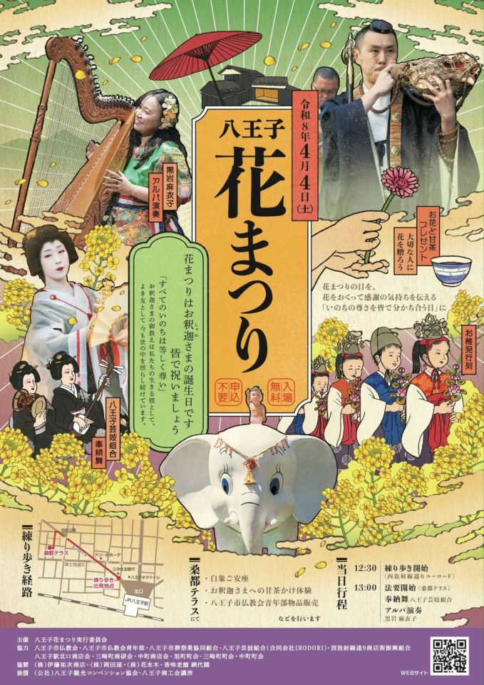 今年の花まつりは、八王子芸妓組合による優雅な奉納舞と、アルパ奏者・黒岩麻衣子さんによるアルパ演奏など、盛りだくさんの内容でお届けします